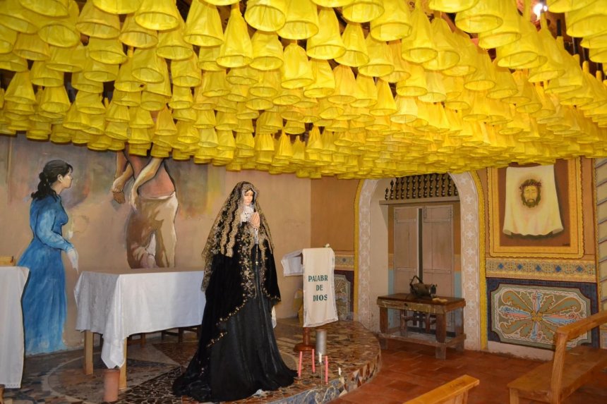 En la capilla de Tañarandy, la Virgen Dolorosa, se encuentra vestida ya para la procesión del viernes santo. Las antorchas que serán encendidas en la Barraca están colgadas por las vigas y tirantes del techo, así adornan la capilla y el entorno de la Dolorosa.