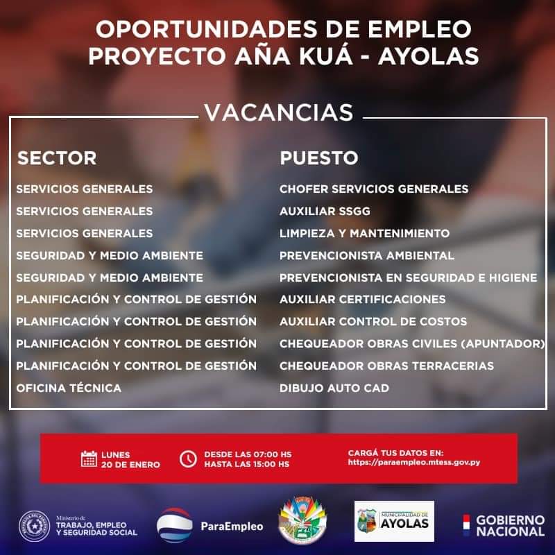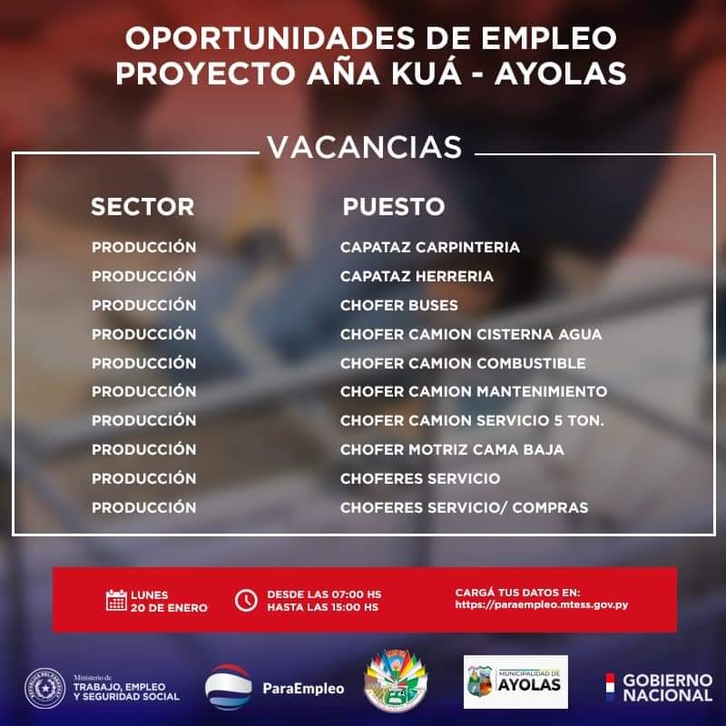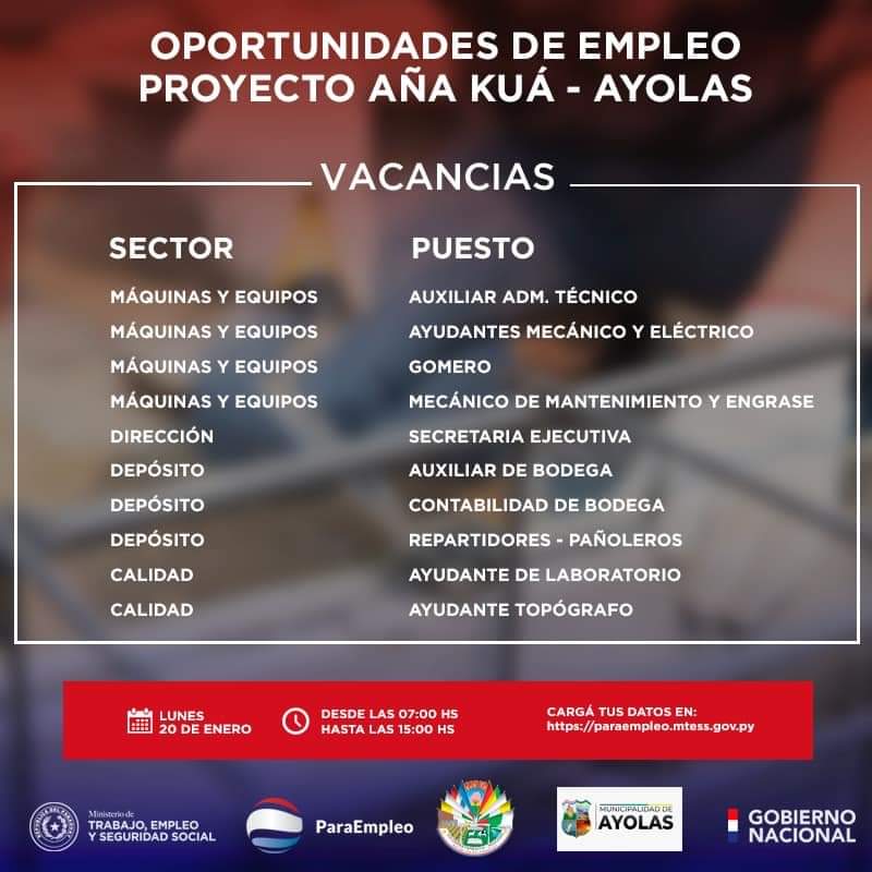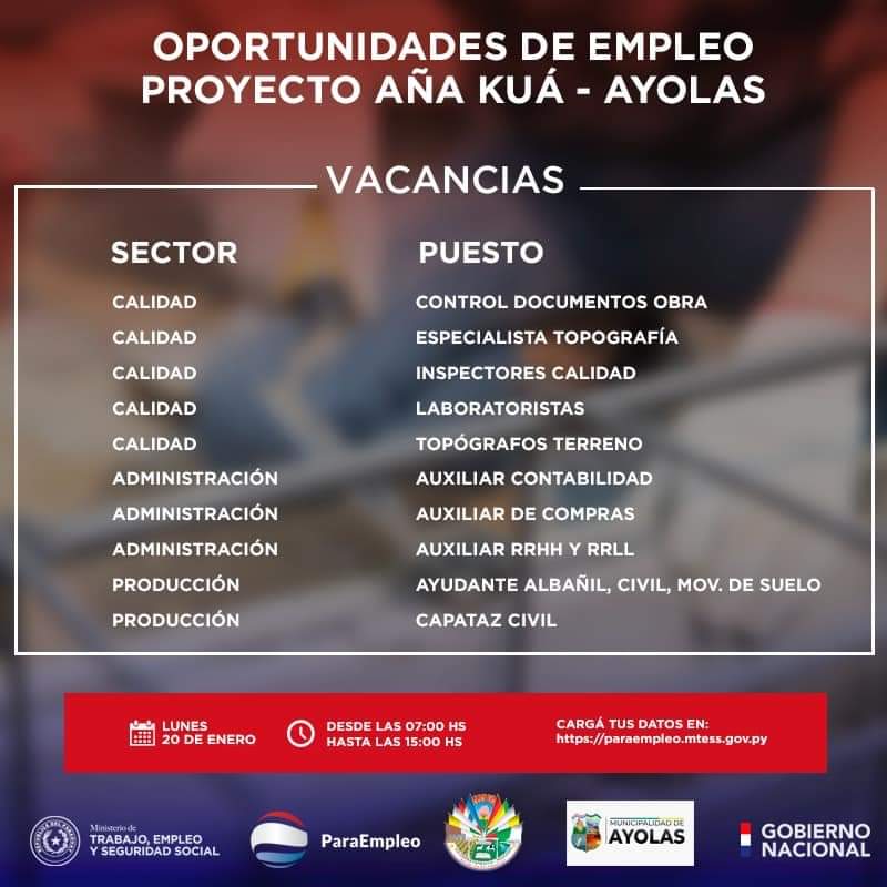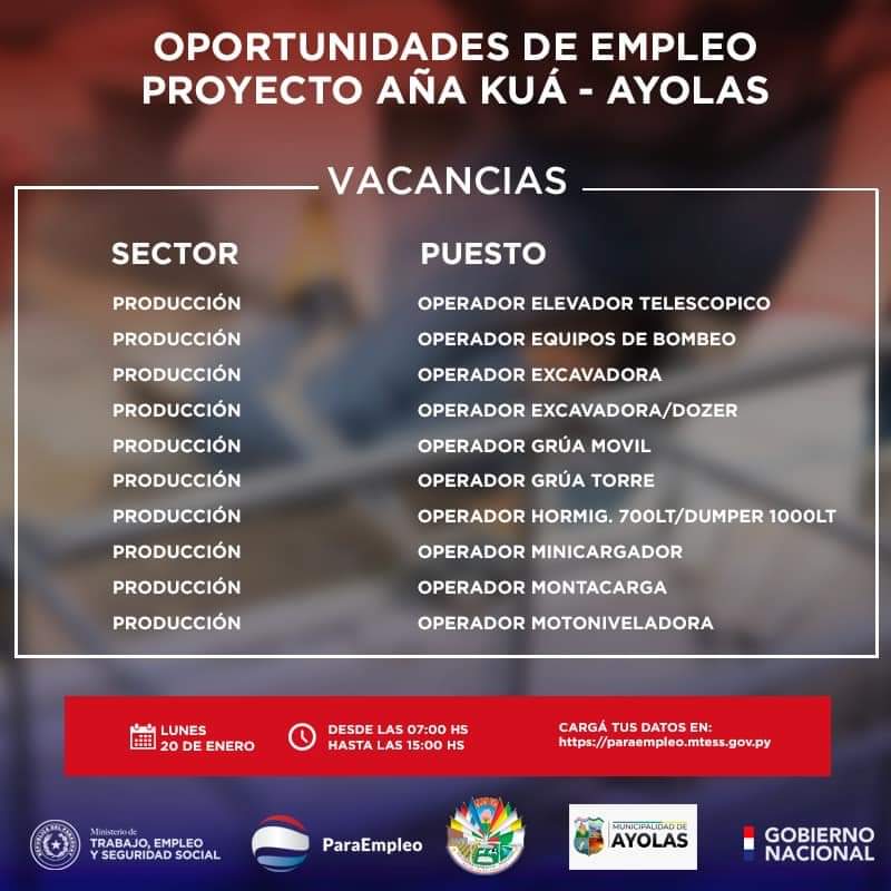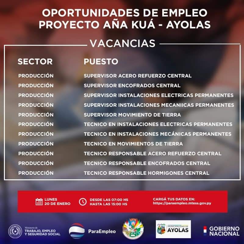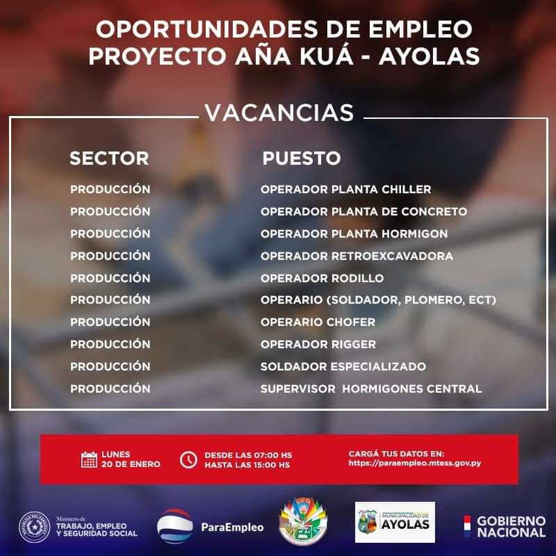 La selección se realizará próximo lunes 20 de enero, en el Barrio Lima de Ayolas, donde se incorporarán 385 puestos nuevos para el proyecto Aña kua.